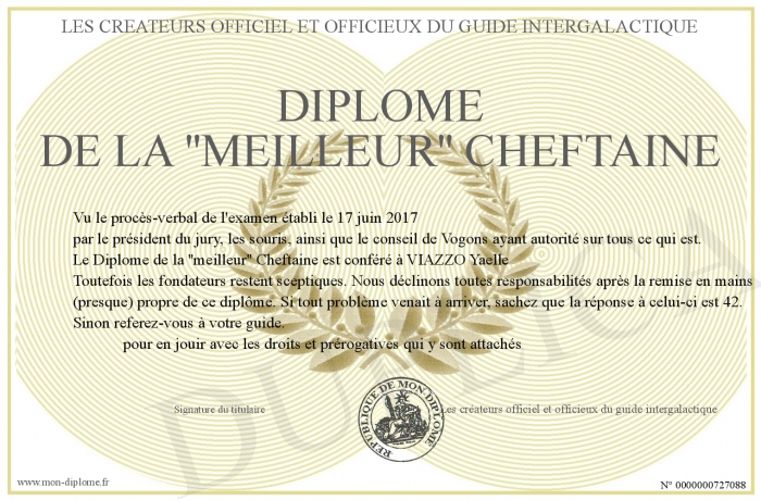 Envoyez par email votre Diplôme de la ''meilleur'' Cheftaine personalisé