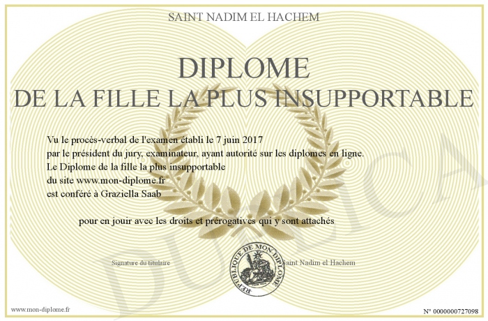 Envoyez par email votre Diplôme de la fille la plus insupportable personalisé