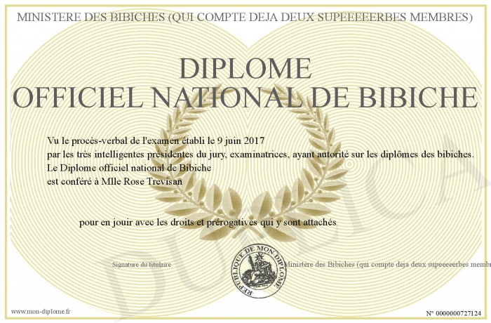 Envoyez par email votre Diplôme officiel national de Bibiche personalisé