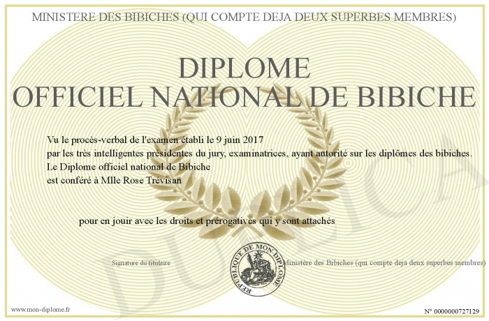 Envoyez par email votre Diplôme officiel national de Bibiche personalisé