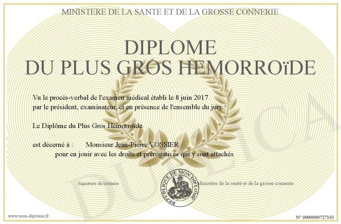 Envoyez par email votre Diplôme du Plus Gros Hémorroïde personalisé