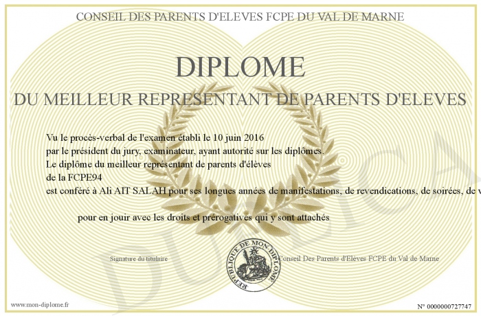 Envoyez par email votre Diplome du meilleur représentant de parents d'élèves personalisé