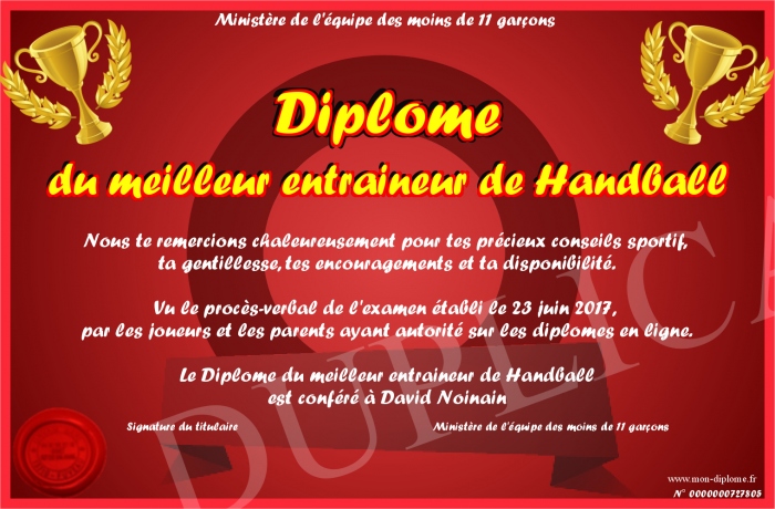 Envoyez par email votre Diplome du meilleur entraineur de Handball personalisé