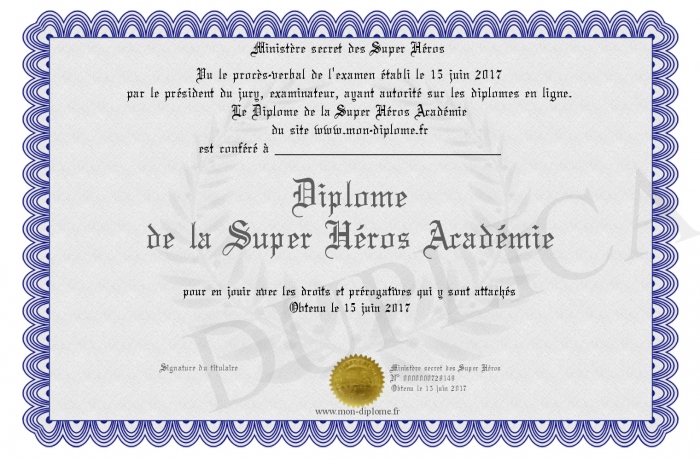 Envoyez par email votre Diplôme de la Super Héros Académie personalisé