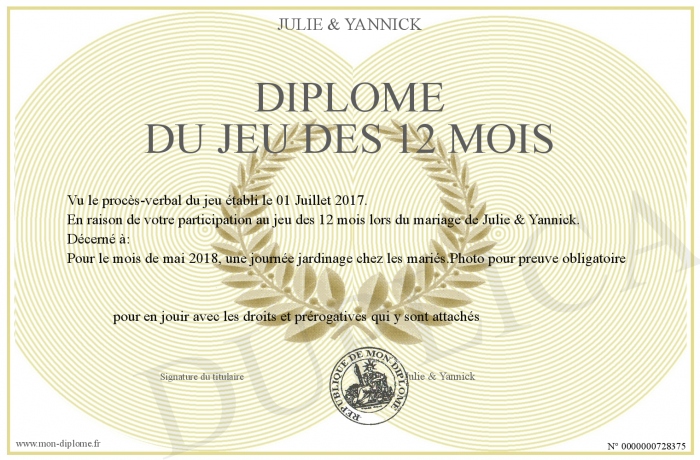 Envoyez par email votre Diplôme du jeu des 12 mois personalisé