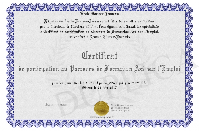 Envoyez par email votre Certificat de participation au Parcours de Formation Axé sur l'Emploi personalisé