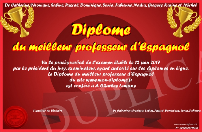 Envoyez par email votre Diplôme du meilleur professeur d'Espagnol personalisé