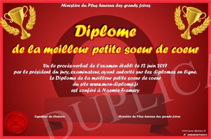 Envoyez par email votre Diplôme de la meilleur petite soeur de coeur personalisé
