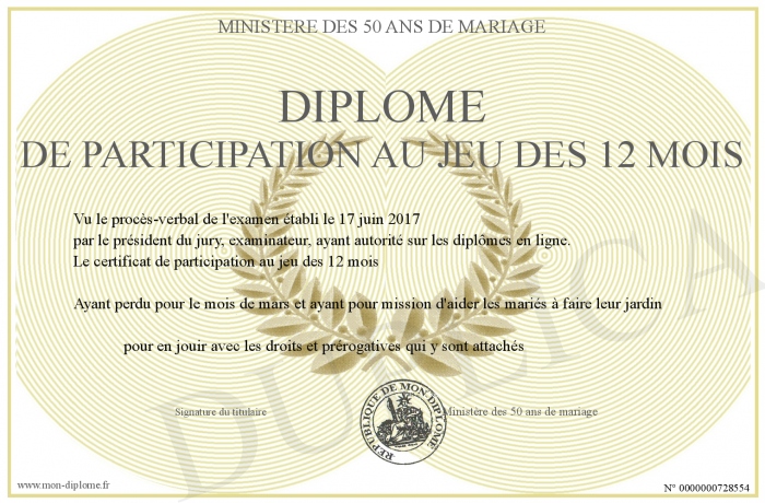 Envoyez par email votre Diplôme de Participation au jeu des 12 mois personalisé