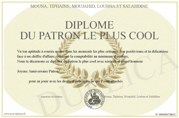 Envoyez par email votre Diplôme du patron le plus cool personalisé
