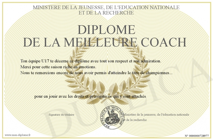 Envoyez par email votre Diplôme de la meilleure coach personalisé