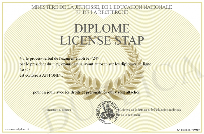 Envoyez par email votre Diplôme LICENSE STAP personalisé