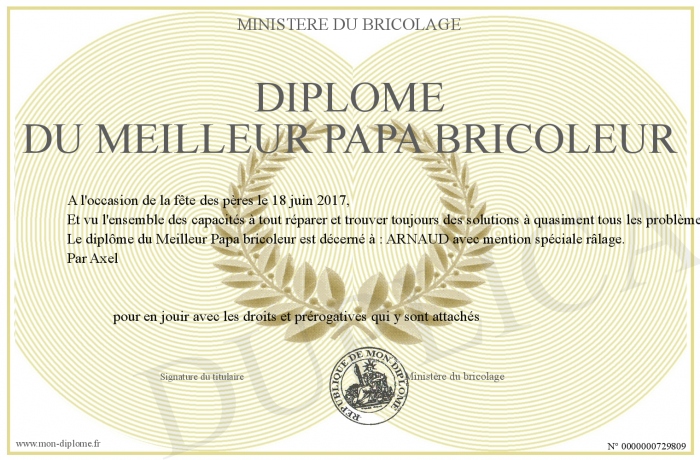 Envoyez par email votre Diplôme du meilleur papa bricoleur personalisé