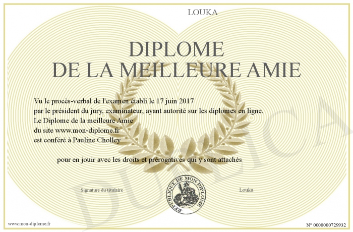 Envoyez par email votre Diplome de la meilleure Amie personalisé