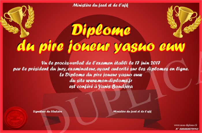 Envoyez par email votre Diplome du pire joueur yasuo euw personalisé
