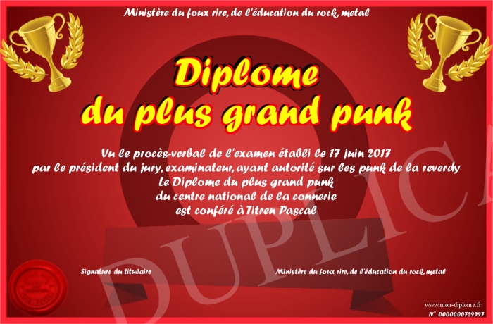 Envoyez par email votre Diplôme du plus grand punk personalisé