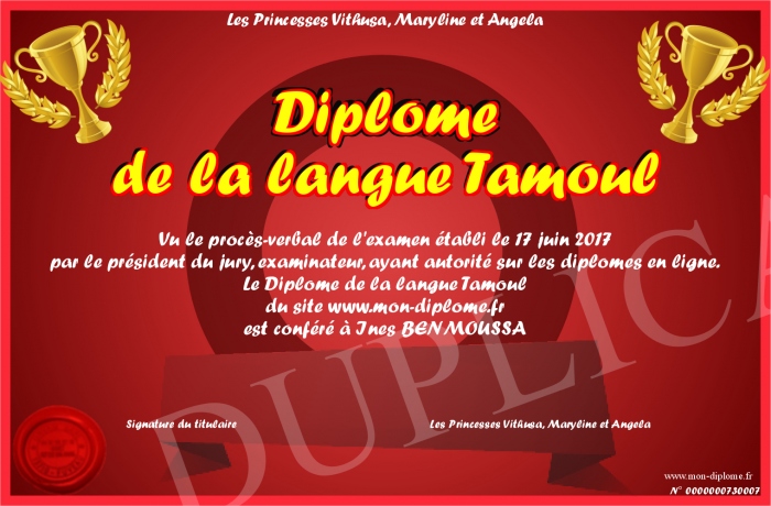 Envoyez par email votre Diplôme de la langue Tamoul personalisé