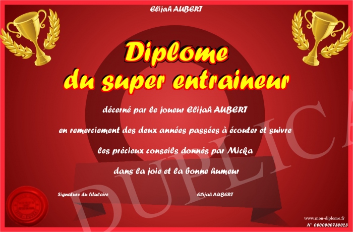 Envoyez par email votre Diplôme du super entraineur personalisé