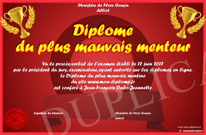 Envoyez par email votre Diplôme du plus mauvais menteur personalisé