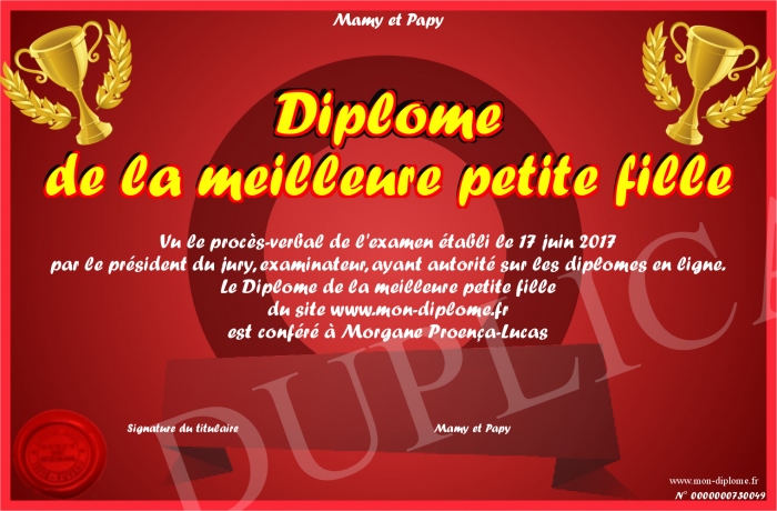 Envoyez par email votre Diplome de la meilleure petite fille personalisé