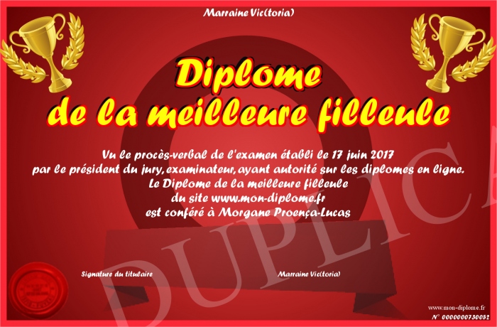 Envoyez par email votre Diplôme de la meilleure filleule personalisé