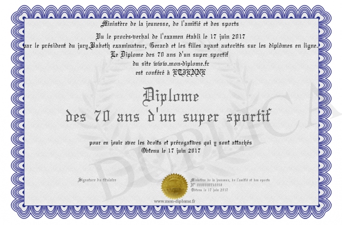 Envoyez par email votre Diplôme des 70 ans d'un super sportif personalisé