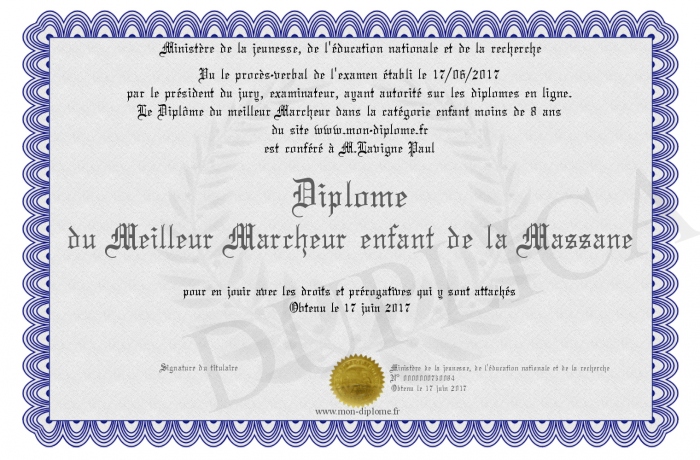 Envoyez par email votre Diplôme du Meilleur Marcheur enfant de la Massane personalisé