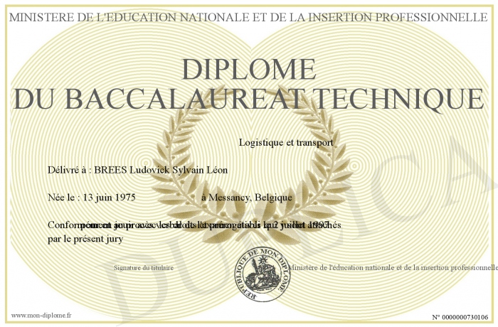 Envoyez par email votre Diplôme du baccalaureat technique personalisé