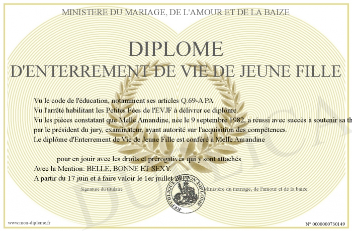 Envoyez par email votre Diplome d'Enterrement de vie de jeune fille personalisé