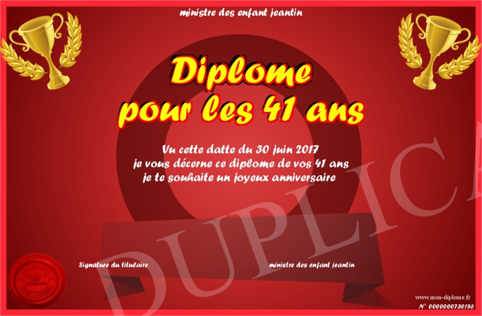 Envoyez par email votre Diplôme pour les 41 ans personalisé