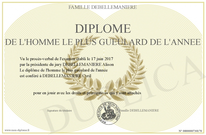 Envoyez par email votre Diplôme de l'homme le plus gueulard de l'année personalisé