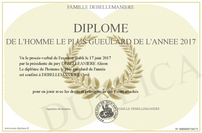 Envoyez par email votre Diplôme de l'homme le plus gueulard de l'année 2017 personalisé