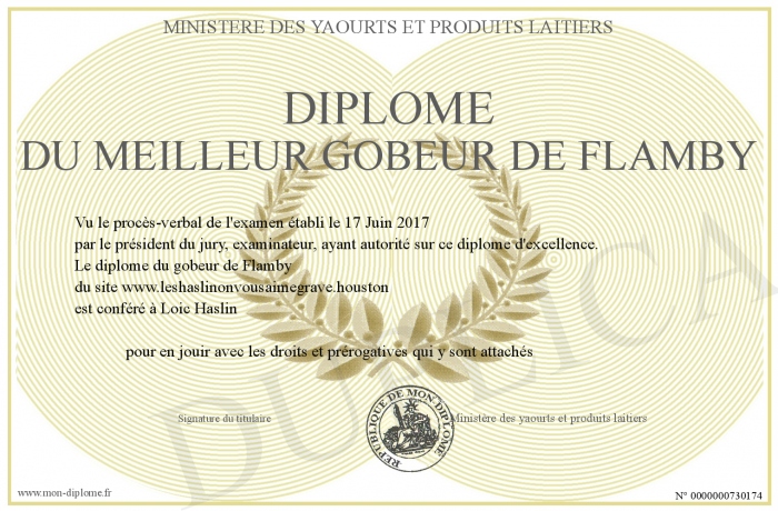 Envoyez par email votre Diplôme du meilleur gobeur de flamby personalisé