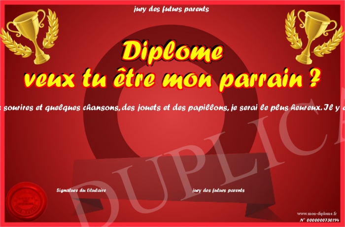 Envoyez par email votre Diplôme veux tu être mon parrain ? personalisé
