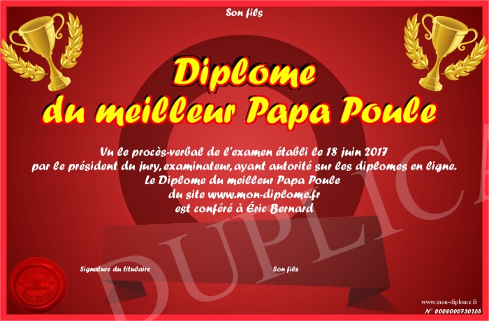 Envoyez par email votre Diplôme du meilleur Papa Poule personalisé