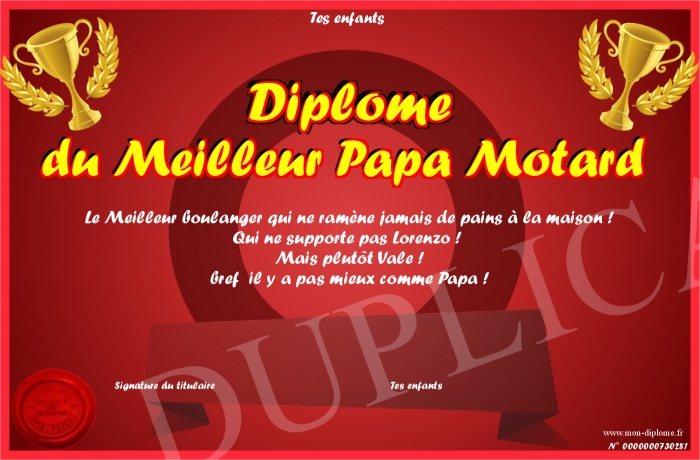 Envoyez par email votre Diplôme du Meilleur Papa Motard personalisé