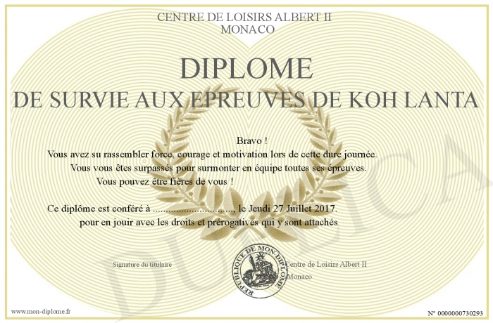Envoyez par email votre Diplôme de survie aux épreuves de Koh Lanta personalisé