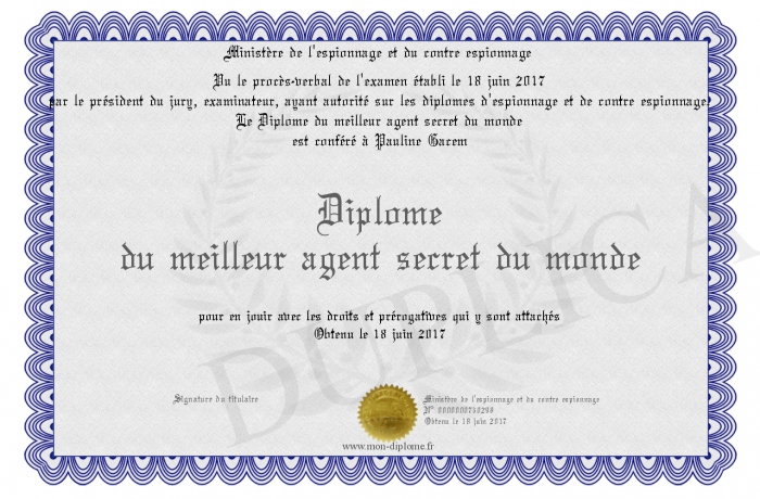 Envoyez par email votre Diplôme du meilleur agent secret du monde personalisé