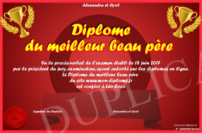 Envoyez par email votre Diplôme du meilleur beau père personalisé