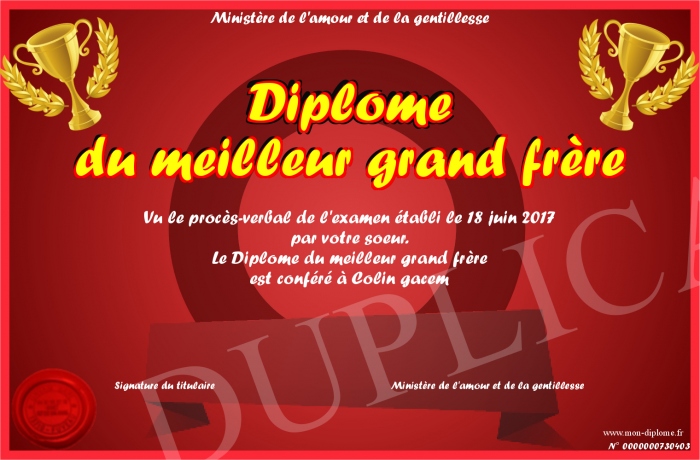 Envoyez par email votre Diplome du meilleur grand frère personalisé