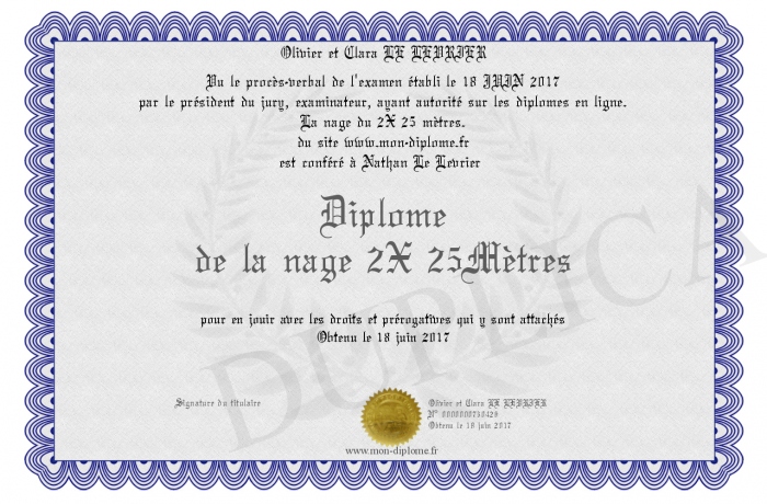 Envoyez par email votre Diplôme de la nage 2X 25Mètres personalisé