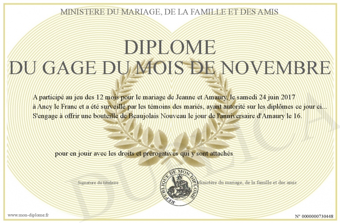 Envoyez par email votre Diplôme du gage du mois de Novembre personalisé