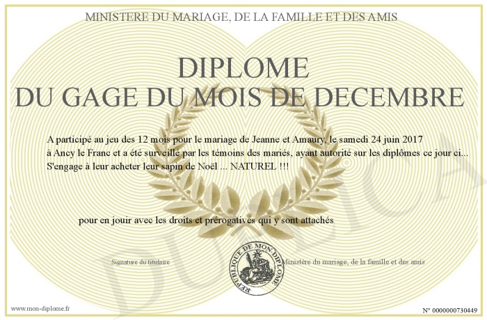Envoyez par email votre Diplôme du gage du mois de Décembre personalisé