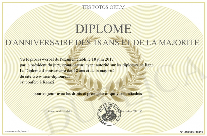 Envoyez par email votre Diplôme d'anniversaire des 18 ans et de la majorité personalisé