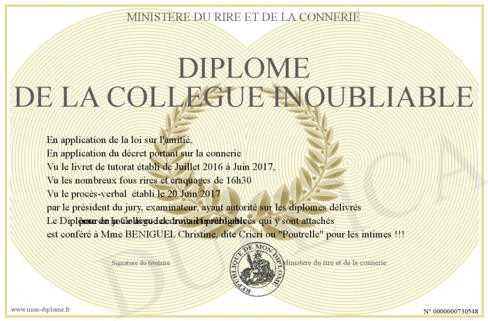 Envoyez par email votre Diplome de la collegue inoubliable personalisé