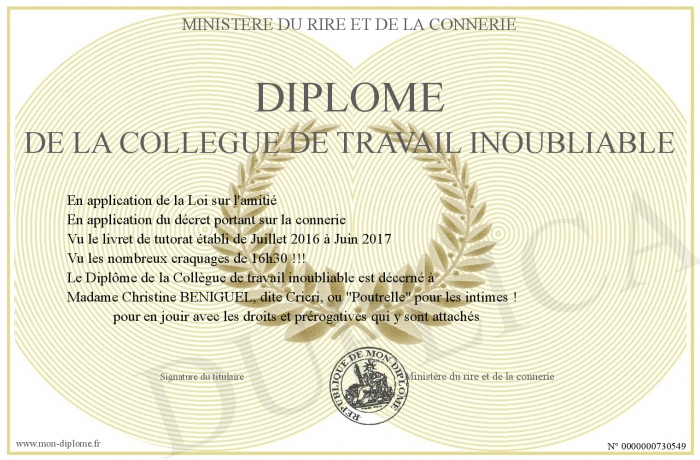 Envoyez par email votre Diplôme de la collègue de travail inoubliable personalisé