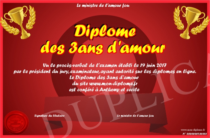 Envoyez par email votre Diplôme des 3ans d'amour personalisé