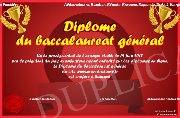 Envoyez par email votre Diplôme du baccalaureat général personalisé