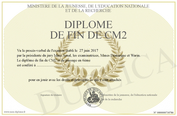Envoyez par email votre Diplôme de fin de CM2 personalisé