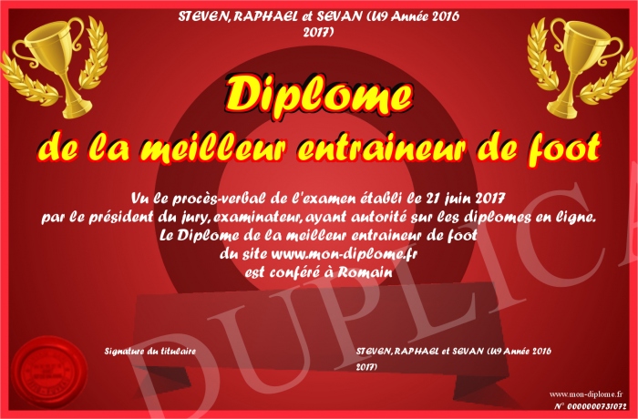 Envoyez par email votre Diplome de la meilleur entraineur de foot personalisé